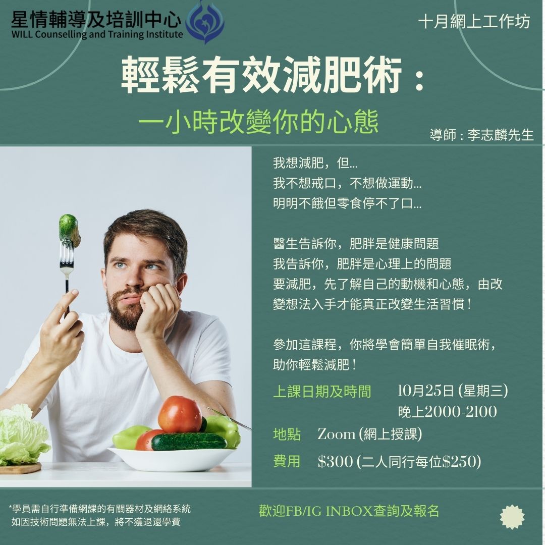 我想減肥,但... 我不想戒口,不想做運動... 明明不餓但零食停不了口... 醫生告訴你,肥胖是健康問題 我告訴你,肥胖是心理上的問題 要減肥,先了解自己的動機和心態,由改變想法入手才能真正改變生活習慣 ! 參加這課程,你將學會簡單自我催眠術,助你輕鬆減肥 ! 上課日期及時間:10月25日 (星期三) 晚上2000-2100 地點:Zoom (網上授課) 費用:$300 (二人同行每位$250) 歡迎FB/IG Inbox查詢及報名
