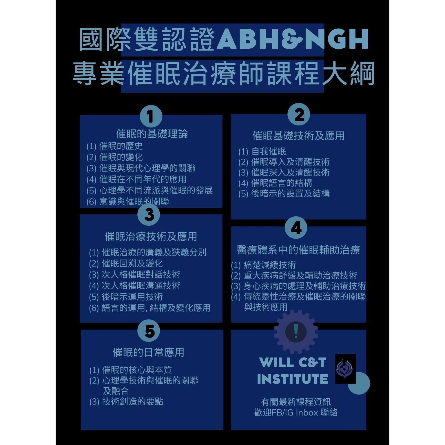 課程內容包括心理學基礎,催眠治療的歷史和基本技術,以及各種不同的治療技術,例如子人格探索、催眠回溯和催眠對話等等。此外,我們還將教授減緩和止痛技術,這些技術在催眠訓練中是非常重要的。
