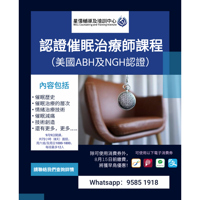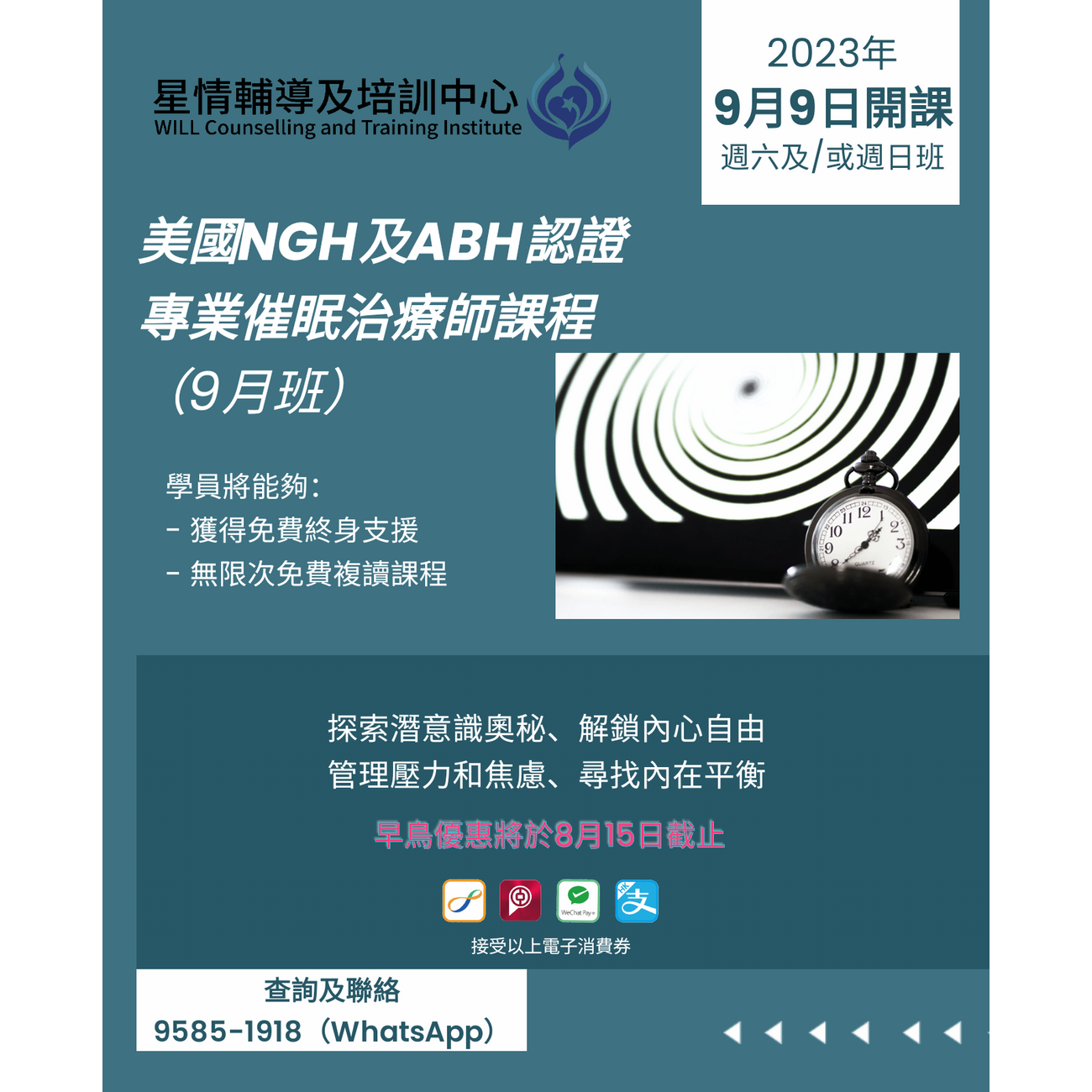 想成為一位催眠治療師嗎?現在有個難得的機會,讓你成為ABH和NGH認證的催眠治療師!所有課程資料,皆由導師個人編寫,保證內容豐富、深入、實用。