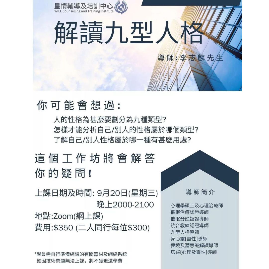人的性格為什麼要畫分為九種類型? 怎樣才能分析自己/別人的性格屬於哪個類型? 了解自己/別人性格屬於哪一種有甚麼好處? 這個工作坊將會解答你的疑問! 上課日期及時間: 9月20日 星期三 晚上8點~晚上9點 費用: 350元 (二人同行每位300元) 學員需自行準備網課的有關器材及網絡系統,如因技術問題無法上課,將不獲退還學費